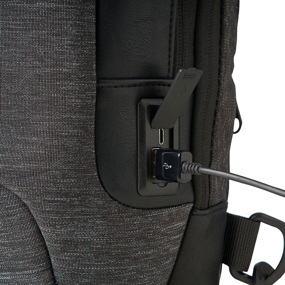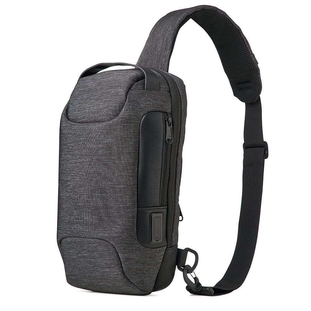 Mochila de ombro 10 litros em nylon resistente à água com três compartimentos, sendo dois deles exclusivos para cartões e proteção contra furto. Contém cadeado numérico (TSA), suporte externo usb, bolso para tablet 9, bolsos internos e revestimento costado espumado.