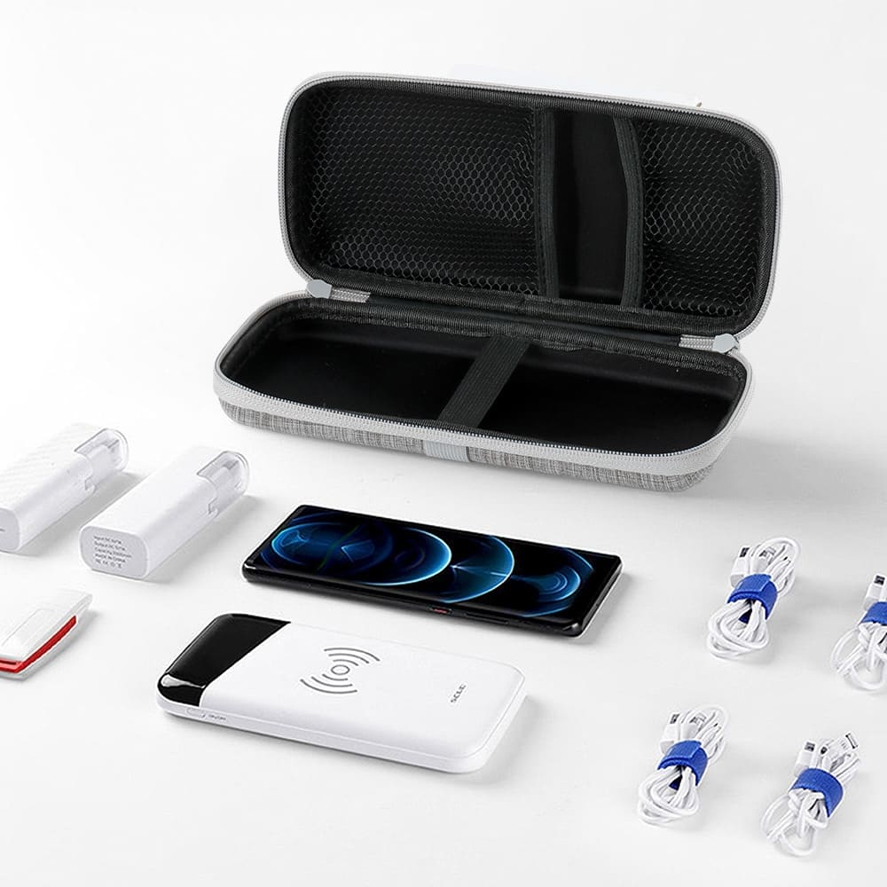 Estojo de proteção para eletrônicos, feito em nylon resistente à água. Contém bolsos telados e elásticos para fixação na área interna e externa.