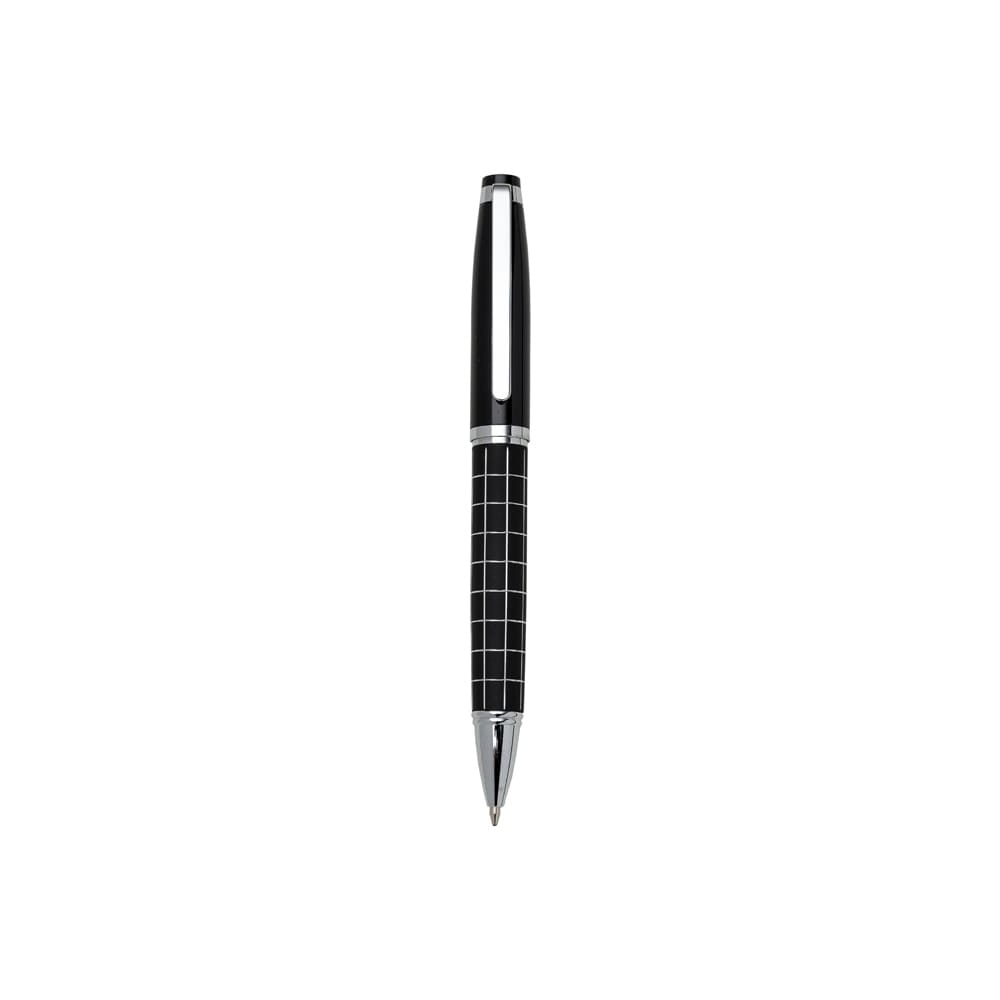 Caneta metal inteira colorida com detalhes prata e quadriculados. Clip metal com anel superior e anel central prata, possui dois anéis em relevo na ponteira. Aciona por giro.