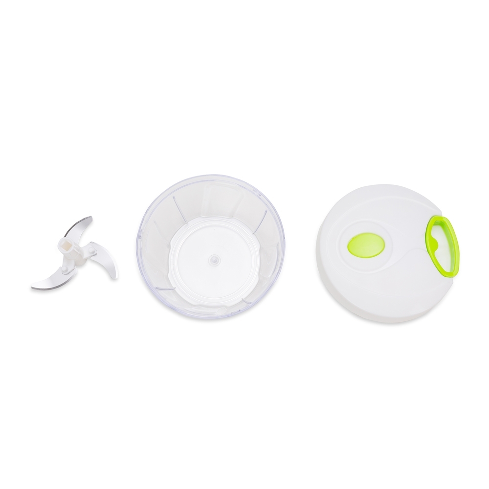 Processador de alimentos manual, tampa plástica de polipropileno com puxador verde, pote transparente em poliestireno com relevo e lâminas em aço inox.