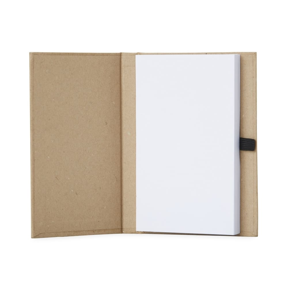 Bloco de anotações capa dura em kraft com porta caneta e wire-o. Contém aproximadamente 100 páginas não pautadas na cor branca.