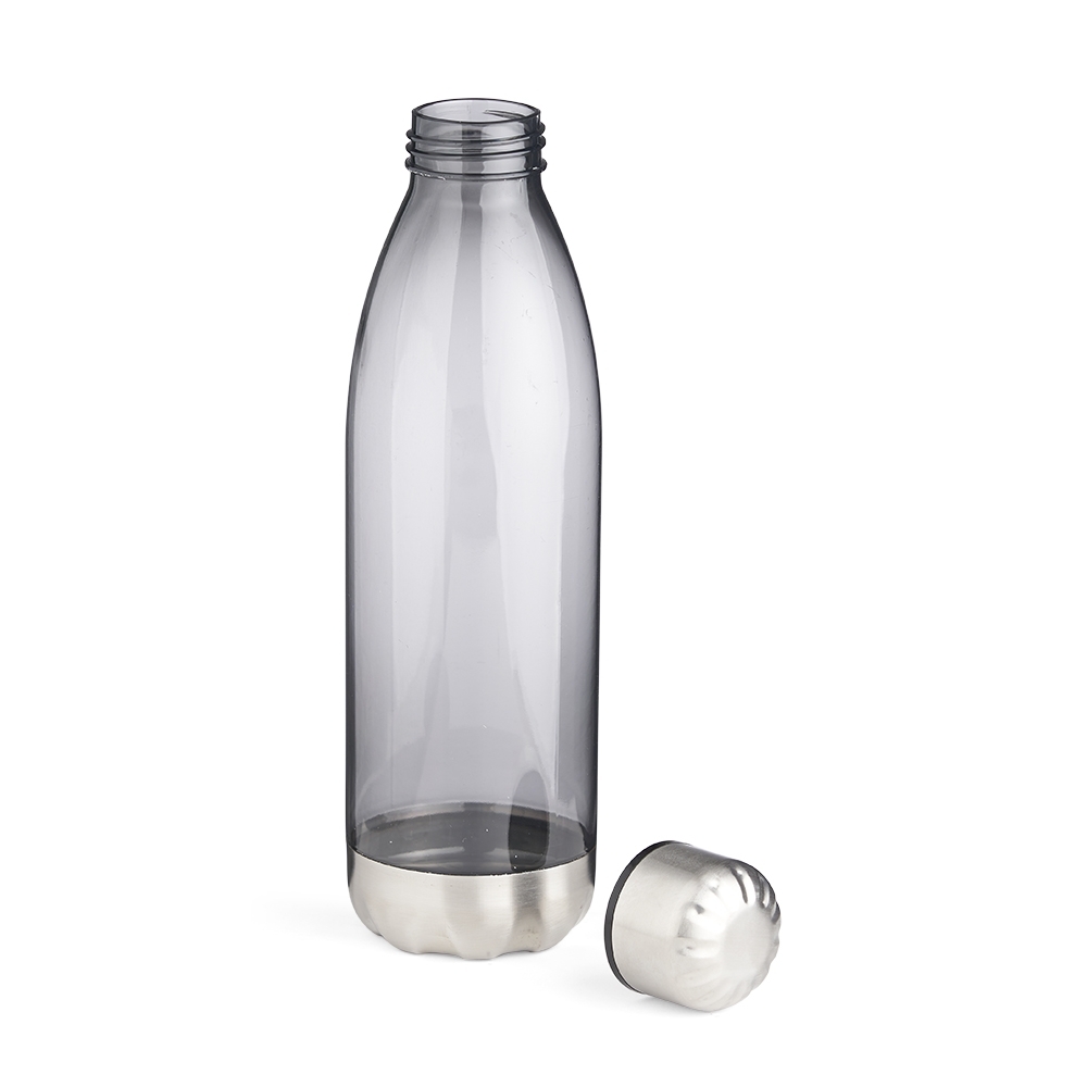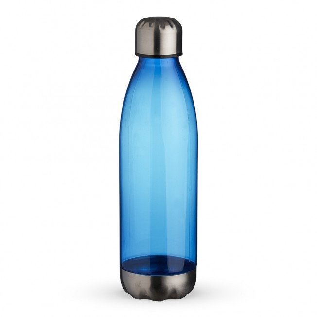 Garrafa plástica 700ml formato garrafa. Corpo transparente colorido, possui tampa e base em alumínio.