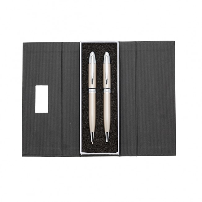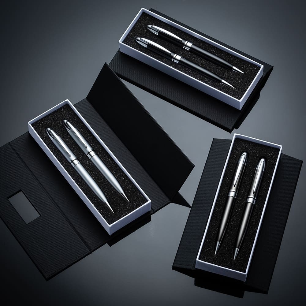 Conjunto caneta e lapiseira em estojo de cartonagem com placa central para personalização. Clip metal e anel central possui: anel fino prata, anel preto fino e um anel maior prata com relevo e acionam por giro. Estojo revestida com espuma na parte interna.