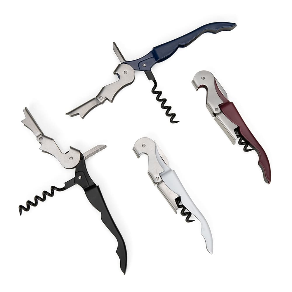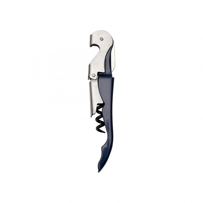 Saca rolhas metálico de 2 estágios com acabamento fosco. Contém abridor de garrafa, lâmina de corte e saca rolhas.