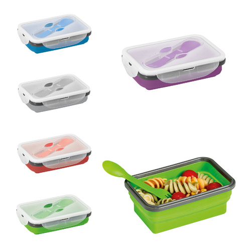 SAFFRON. Marmita hermética retrátil em silicone e PP com um compartimento com capacidade até 640 ml. No topo da tampa tem um encaixe com um talher (incluso) com função 2 em 1, garfo e colher. Apta para microondas (retirar a tampa).