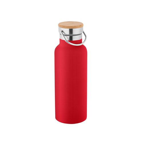 RAGNAR. Squeeze em aço inox com parede dupla isolada a vácuo, tampa em bambu e alça de transporte em aço inox (térmico). Capacidade até 570 mL. Fornecido em caixa presente de papel kraft.