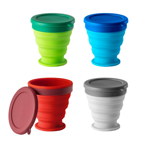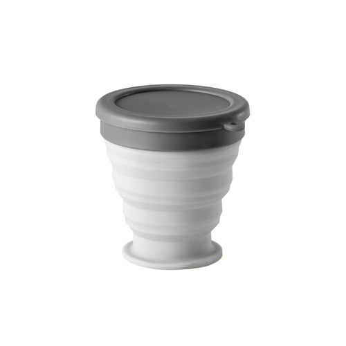 Copo de viagem dobrável em silicone com tampa em PP. Contém uma argola na base que serve como pega ou para pendurar. Copo com capacidade até 240 ml.